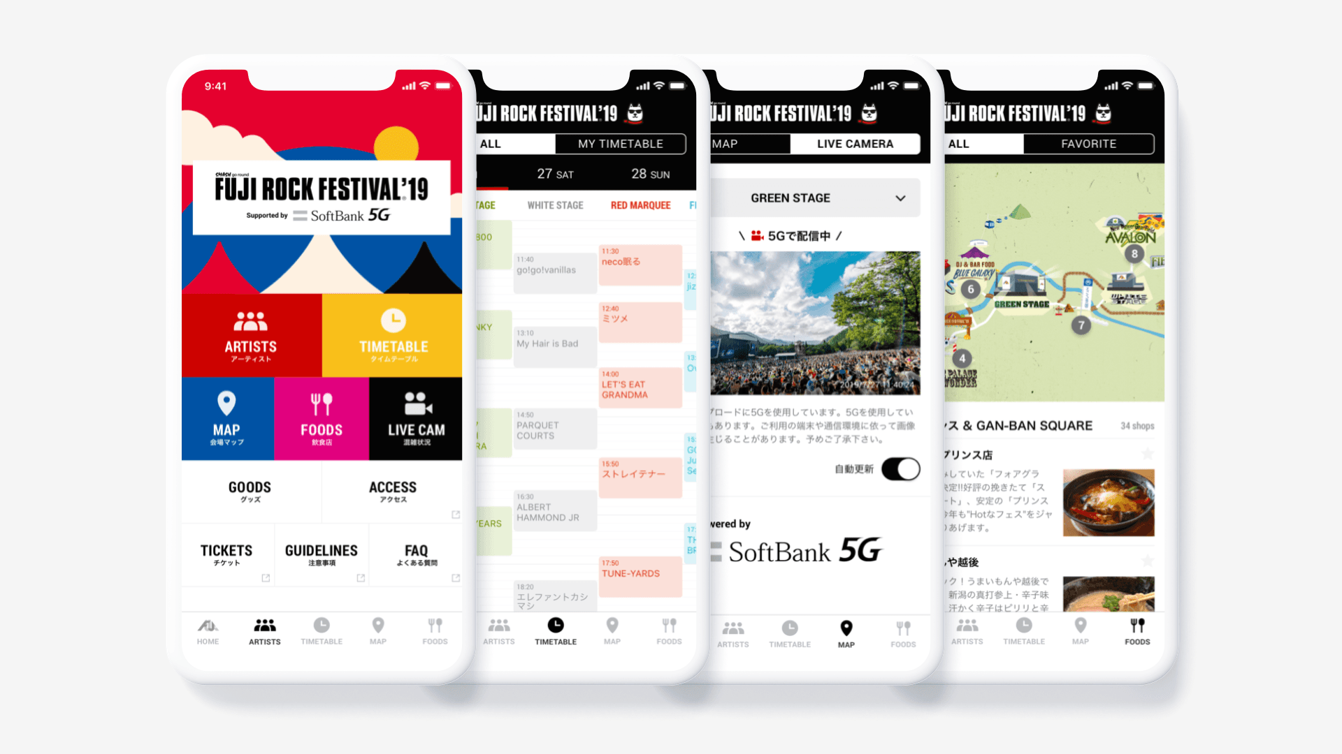 公式アプリ「FUJI ROCK ’19 by SoftBank 5G」のUI/UXディレクションとデザインを担当しました。
