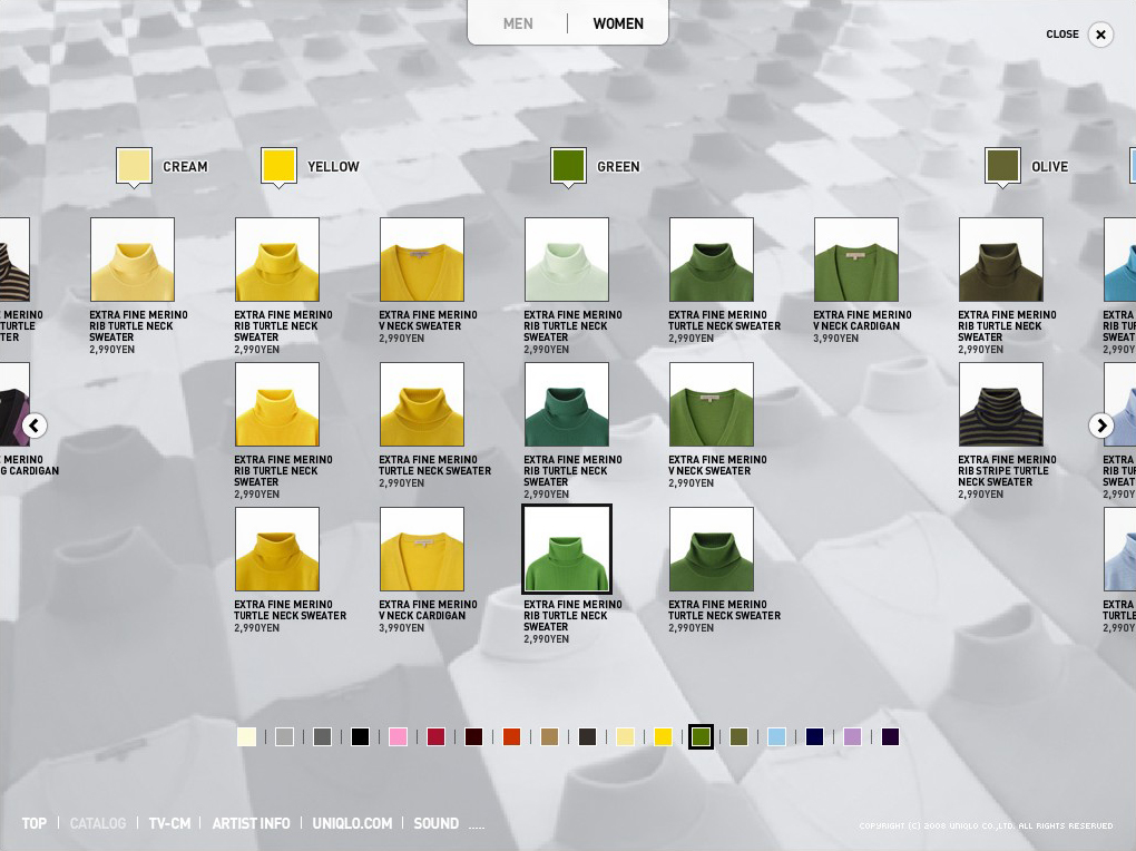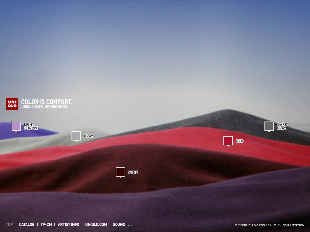 We made the website for Uniqlo’s Merino Wool campaign. The key phrase for this campaign was “COLOR IS COMFORT: 心地のよい色たち,” which we interpreted as a floating landscape of merino wool. The website furthers the geography into a simple interface, allowing the users to fly up and over the hilly mountains and click on the floating color chips to view the catalogue.