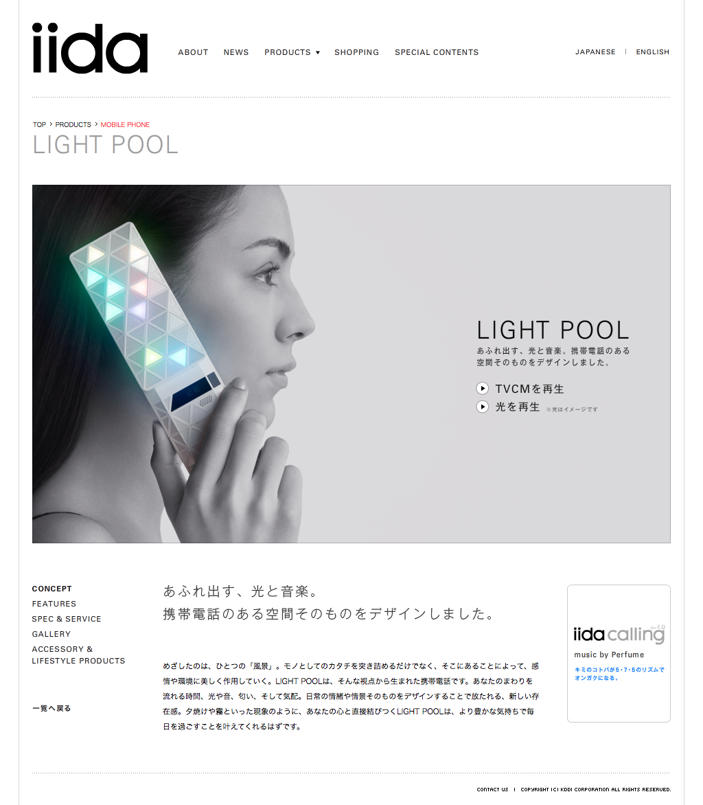 iida LIGHT POOL May 2010 WEB Credits: Creative Direction : Satoshi Takamatsu (ground) Art Direction : Yugo Nakamura (tha) Design + Programing : Sohei Kitada (tha)